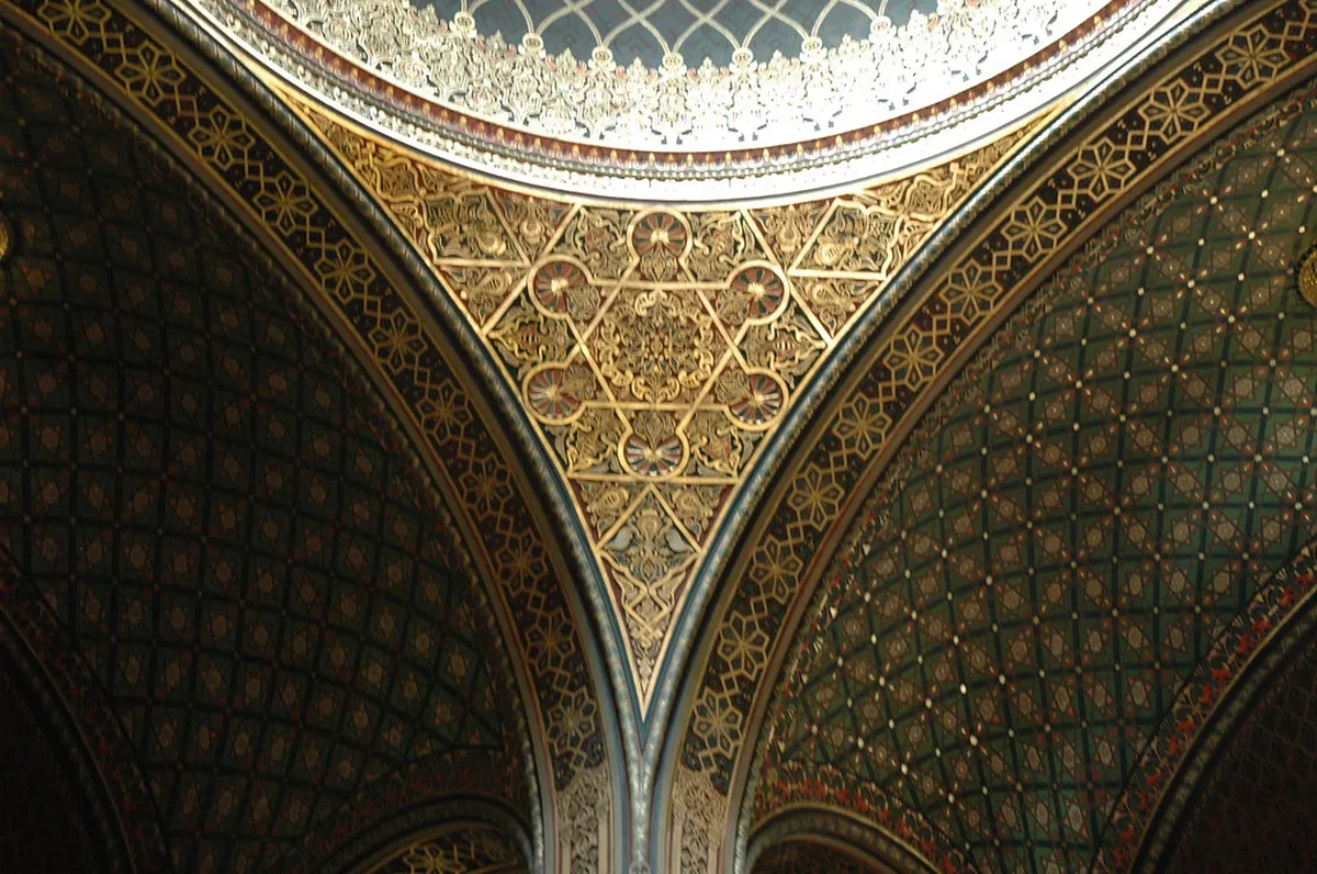 The visual styles of these two buildings could not be more different. The Spanish Synagogue features a Moorish Revival design. It was inspired by the Alhambra in Spain. Inside, every inch of the walls is covered in gold and geometric patterns. It feels bright, warm, and incredibly detailed. It is often called the most beautiful synagogue in Europe.
